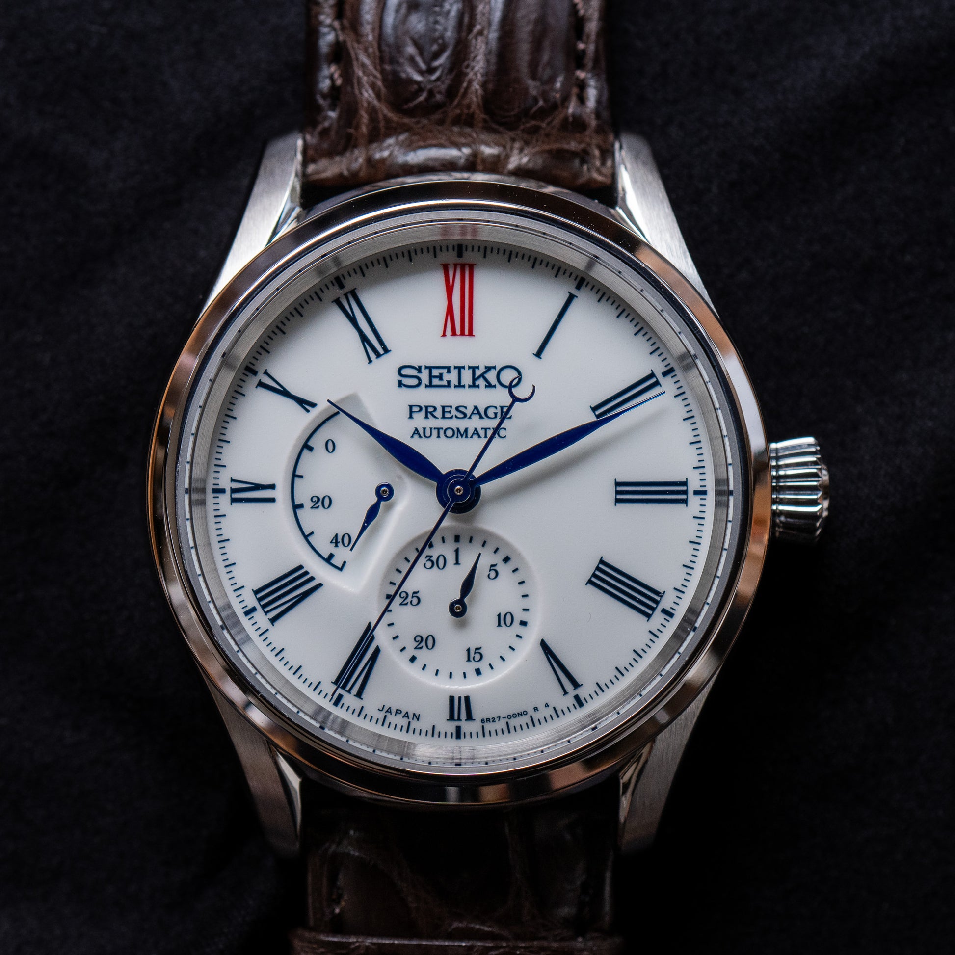 The Movement. Inside is a 6R27, which is a hi-beat upgrade to the more standard Presage 6R15 movement. With 28,888 bph, 29 jewels, and the circular day complication with power reserve.