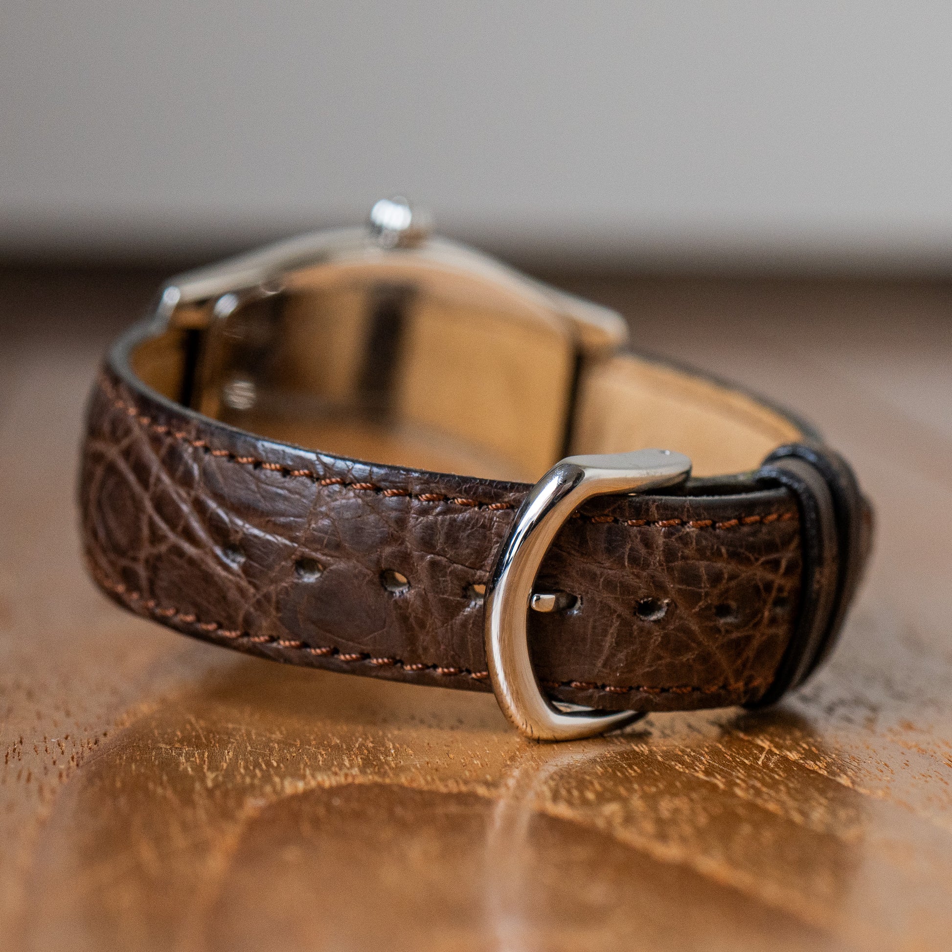 Condition: In great condition overall. Minor marks can be seen on close inspection in on the silver casing. The caseback has more noticeable markings. Comes on the Laurel leather strap.